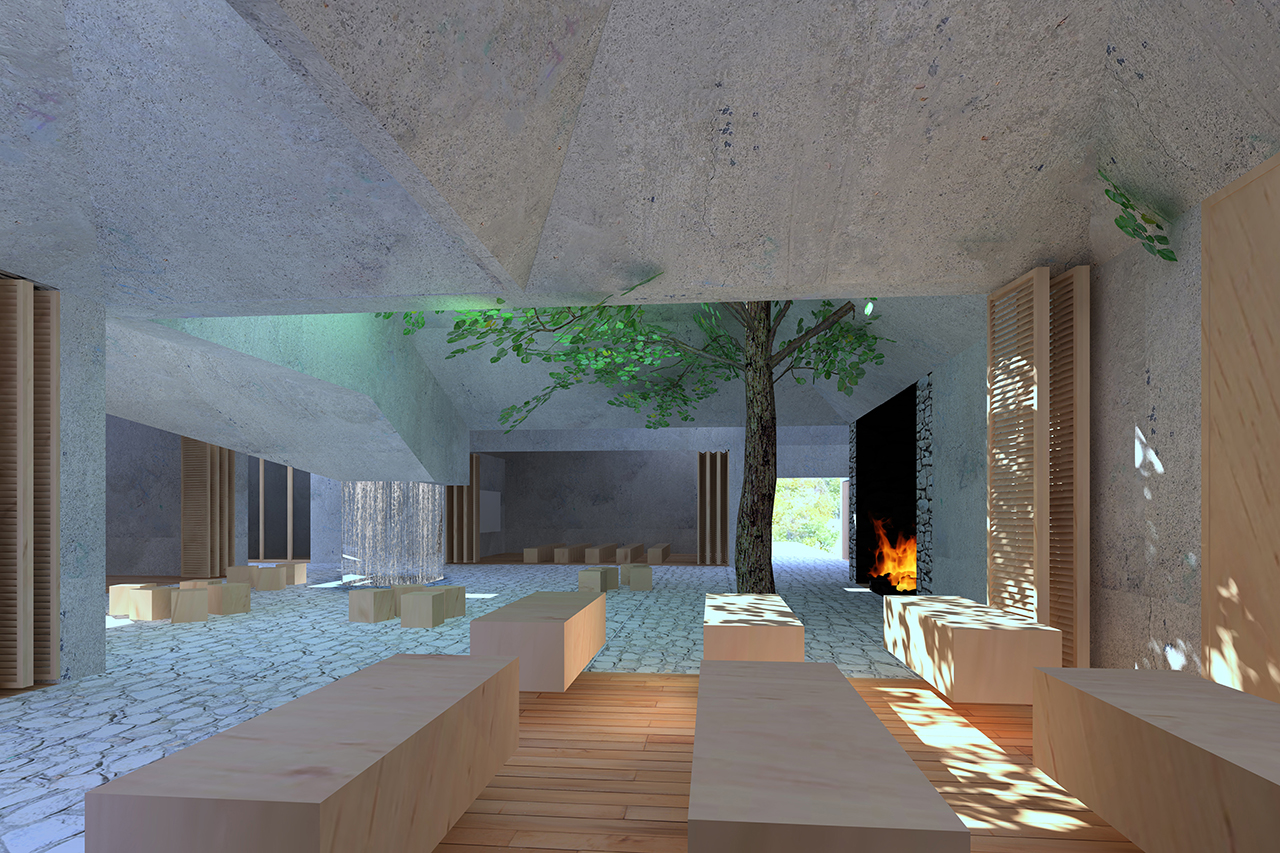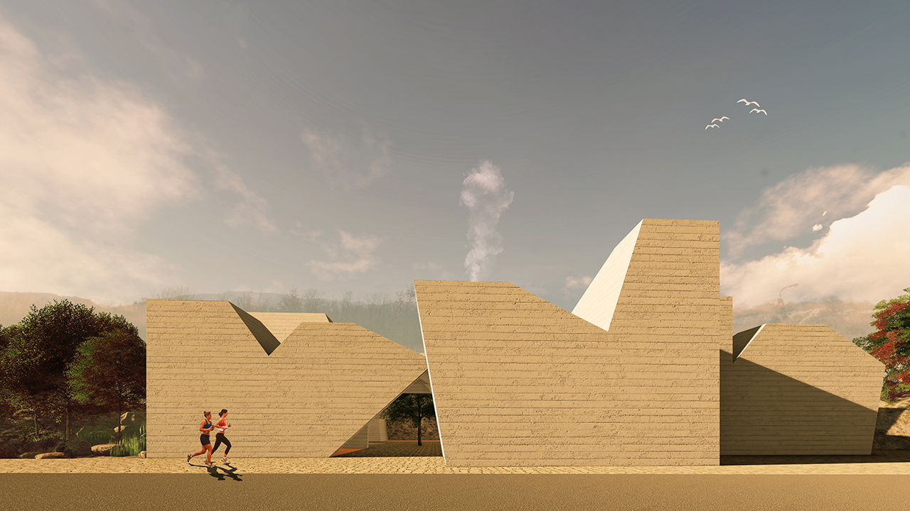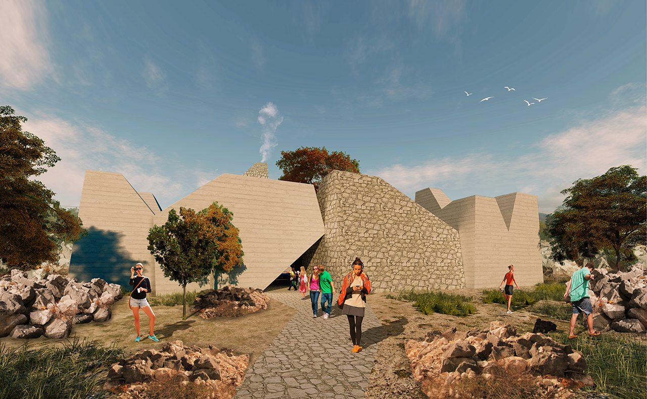 Nepravilni volumeni od grubog betona s otvorima na vrhu čine nakupinu koja kao da je oblikovana kakvom tektonskom silom.