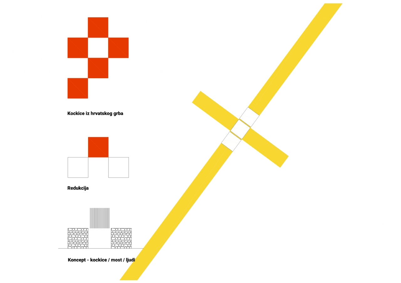 Tri prepoznatljive kocke iz hrvatskog grba koriste se kao prostorni volumeni kojima se oblikuje vidikovac. Donje dvije kocke građene su od suhozida i u njima su utisnute stepenice koje vode na gornju središnju kocku – most, okvir i vidikovac. Dodavanjem treće kocke taj znak postaje simbol hrvatskog identiteta. Čelični most svojom je materijalizacijom potpuna suprotnost dvjema kamenim kockama, njega pridržavaju stupovi – hrvatski branitelji i civili stradali u Operaciji Maslenica. Stradali nose most snažne simbolike, oni čine vezu između dvaju kocaka, između mora i kopna, sjevera i juga. Podnožje stupova mjesto je za kontemplaciju.